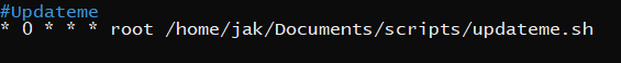 As you can see the user root is specified. it will run this updateme.sh script with root permissions. I run this script everyday at midnight. It is not a production server so I would rather a bug to happen because of a bad update or patch then leaving it unpatched. Last but not least you can also run the sudo crontab -e command and that should bring up another job scheduled with sudo permissions for that specific user.