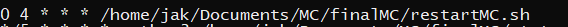 The first job I created is with a script labeled as restartMC.sh. From left to right again you will notice that at 0 minutes at 0400 in the morning on every day of the month this script will run. This allows my server to refresh every night.