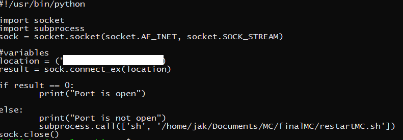 As I said very basic. Simply looks to see if the port that I specified under location variable is open. If it is not open then it calls the resartMC.sh script. Otherwise prints to screen “port is open” and then closes connection. Python is awesome!