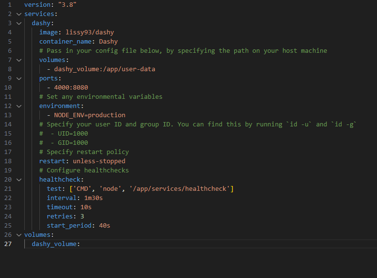 • volumes : Having a volumes directive will allow us to have a persistent volume. So if we ever need to migrate or would like to backup the data, we can do so. dashy_volume is the name and /app/user-data is the directory we are looking to have access to locally.