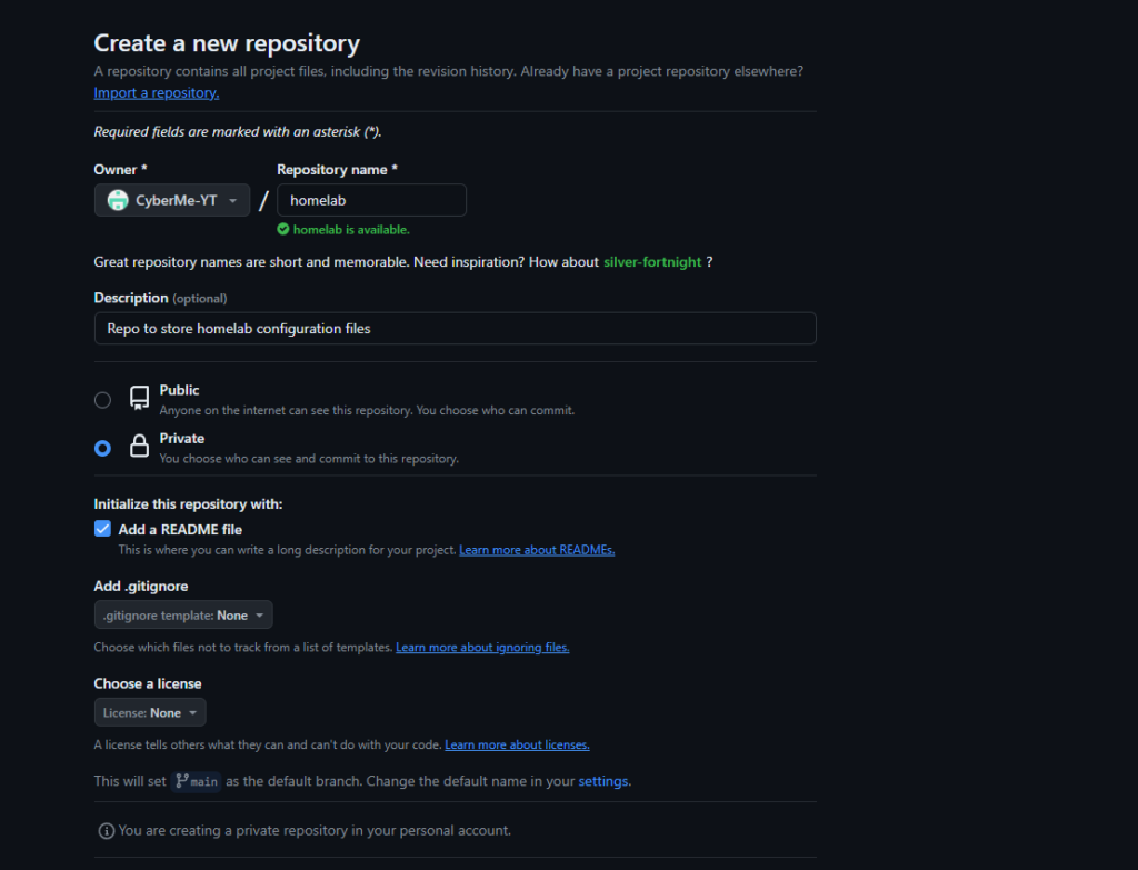In the Create a new repository page you will want to assign a name and description. I will leave it up to you if you would like to make it private or public. In my case I want to have it as a private repo. I also added the README file which can be added later on. This will be used to create a brief overview of everything going on in my homelab.