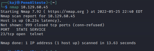 As you can see above, in 13.63 seconds we were able to find our first open port. Port 23 is always a good port to find open when pen-testing. I say that because telnet was not developed with security in mind. Telnet is not encrypted and all traffic is sent over plain-text.