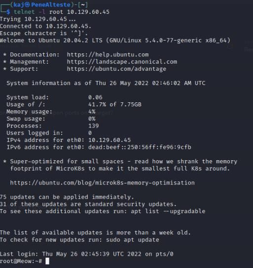 In order to use telnet, all we need to do is specify the user (-l) and target (ip address of VM)