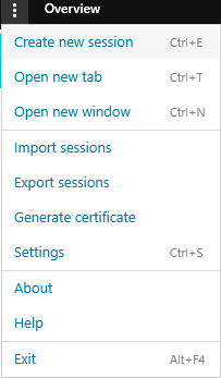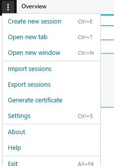 At the top left of the window you can click the three dots. Here you will find all the options for this application. Also with some easy shortcuts. Lets start with heading over to settings. You could just create new session but within the settings menu you will have all the options to better manage multiple sessions.