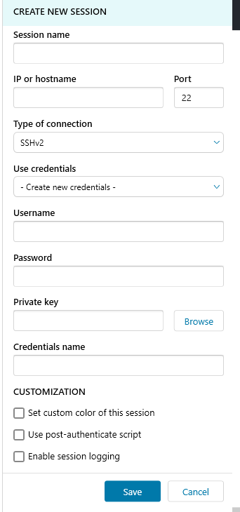 Going back to Solar-PuTTY, the .ppk file will be stored under the Private key option. Next is the Credentials name option. Here you can enter a custom name which will save the Username, Password and Private Key, allowing for importing to other sessions. If the server is only using key authentication you can leave Password blank.