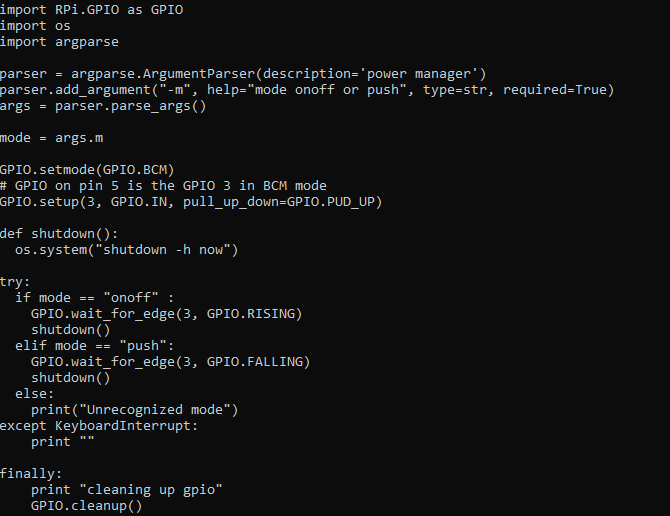 Now that we have access we are going to create two files. The first file being the python code to interact with the GPIO pins and the other file being a bash script to run the python file on startup. A disclaimer I did not write this python code, I am still learning python. It is fairly easy to understand if you have any experience with python. You can create the python file anywhere, I created mine in the home directory (~) and named it pyshutdown.py