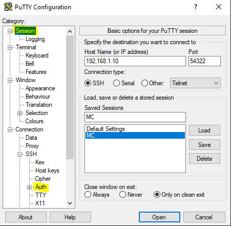 The two tabs you will spend most time in are Session and Auth. Under session you want to enter IP address, Port and connection type.