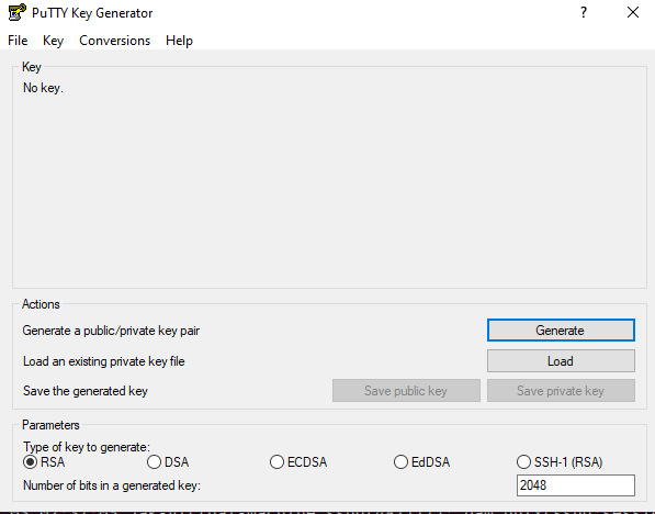 With this application we are able to generate the key. Ensure RSA is selected. Number of bits is your decision, for the purpose of this lab I left it at 2048. 4096 bits is not a bad idea either depending on what you plan on doing. All you have to do next is select Generate. It will then ask you to move the mouse around to randomize the key.