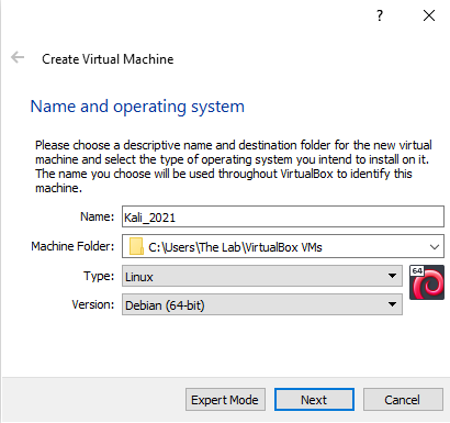 On the user interface along the top you will see a “new” option. If you click this option several things will begin to happen. Starting with the naming and type. For todays example it will look similar to the picture. Of course you can name it whatever you would like and choose whatever folder. Since we are using a Kali Machine the version is Debian based.