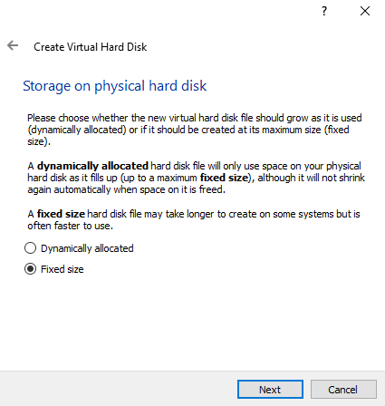 Depending on personal preferences you may decide between a dynamically allocated HDD or a fixed size. Personally I like to set the memory to a fixed amount, preventing me from going over and putting too much on my host machine. Especially when you start creating more VM’s, management of space is important.