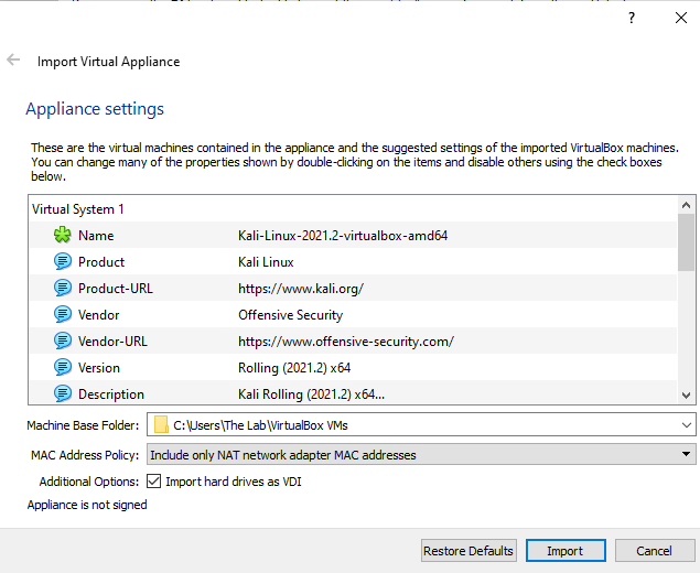 This was the first time using a prebuilt Kali package and I thought the process was too easy! After downloading it from the website (posted above) you just need to run it. It will then open a dialog box within VirtualBox with some settings.