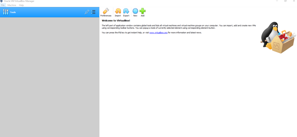 Once VirtualBox is installed, the first startup will look similar to the picture posted above depending on the version. A popular alternative to using a prebuilt package is downloading an ISO and adding to VirtualBox. I will do a brief walkthrough highlighting the key steps to get you going.
