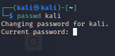 It is probably best to create another user or at least change the name of the Kali user but for the purpose of this instruction you can change the password with passwd followed by the username. It will ask for current password followed by the new password.
