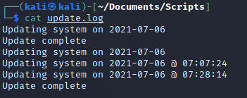 Two things I did not mention include echo and >>. The echo command allows for text to be displayed to the user executing the file. The >> command writes to a file. So in this case instead of writing to screen we decided to write the update started with time/day to a update.log file. Once this update is complete it will then write out that the update is complete within the .log file. If this file does not exist it will create its own. You can also decide the path for the file, otherwise it will create within its current directory.