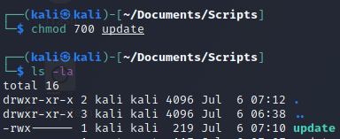 Another way we could do this is by setting the individual permissions with its associated binary. For instance to set read/write/executable rights for the owner we would use chmod 700 update. As you can see rwx——. The color of the file has also changed, showing its ability to be executed.
