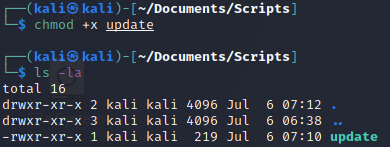 Awesome! We now have a file called update. Lets run it. Well first before we can do that we must give the permissions. With listing the files using the -la options we noticed that update file is showing rw-r–r–. I can explain this in another writeup but for the purpose of this example we are looking for an x. The x will grant the permission to execute said file.