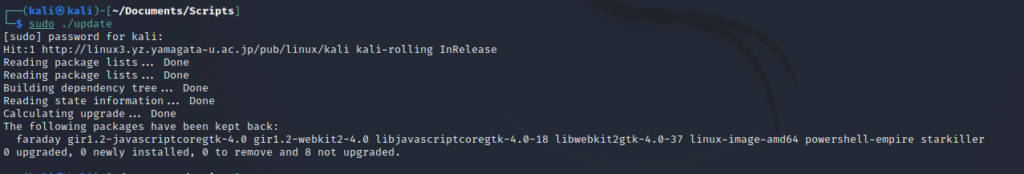 In order to run the application you will use the sudo ./ command, followed by the filename. As you can see in the picture above it started the update/upgrade process. Since everything was up to date nothing was changed.