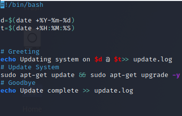 One method within a Linux environment is Bash. To my understanding it is essentially a programming language or often referred to as a scripting language. Giving the developer the ability to write code within a shell. Allowing for the same syntax used within Linux. Super cool! Unlimited opportunity. Many professional hackers and those alike develop these small programs to automate scanning and pen-testing. Today’s example is a script that updates the system along with some small logging functionality.
