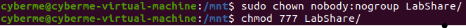After configuring the firewall we will want to change ownership of share to nobody/nogroup along with read/write/execute permissions for user/group/everyone else. This can vary from one lab to the next but for me personally I want all of my assigned users to have read/write.