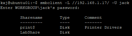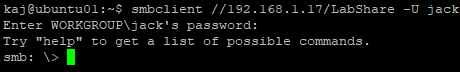 Before discussing mounting, I wanted to cover the smbclient method. This method can be used to temporarily access a share. The following command will list all shares setup on server
