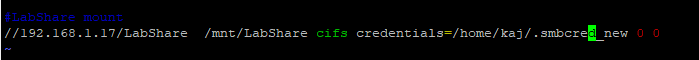 The last step before mounting the share is to edit /etc/fstab and placing the following line at the end of the file. It is a good idea to use comments to label what it is you are mounting.
