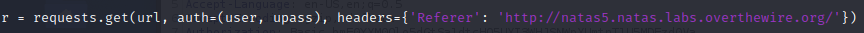 As discovered last time, this particular line is referencing a particular header “Referer”. Without modifying this it is saying we are coming from Natas4. Instead we want it to say we are coming from Natas5.