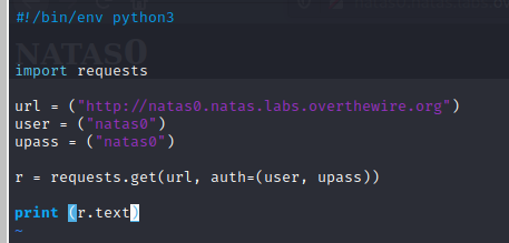 The last line is print (r.text). This print function is just displaying the text value of r (UTF-8). Essentially this is doing the same thing as if we were to view source code on Google Chrome or Firefox. We now have the password for Natas1.