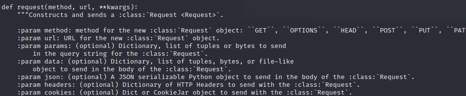 That is because the request function as seen below is looking for several arguments. (from what I understand the first argument “method” is defined with .get or .post etc..) The first argument the request function is looking for is the url. because we are passing it in order (inside our r variable) we do not need to define what we are passing. In other words if we were to move the url parameter to the right of auth we would have to define url=url. Similar to how anything after url will need its parameters defined with =. This will make more sense as I continue onward.