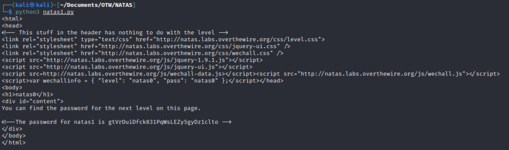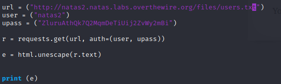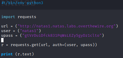 Now that we have the password for the next level, we will go ahead and copy this file and rename it to natas2.py. In natas2 we will modify the three variables, allowing access to natas1.