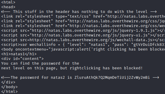 If we were running this on the browser we would not be able to right click and view source. Instead we would of had to use the hot-key to gain access. Since we are using python we do not need much and already have the password for the next level.