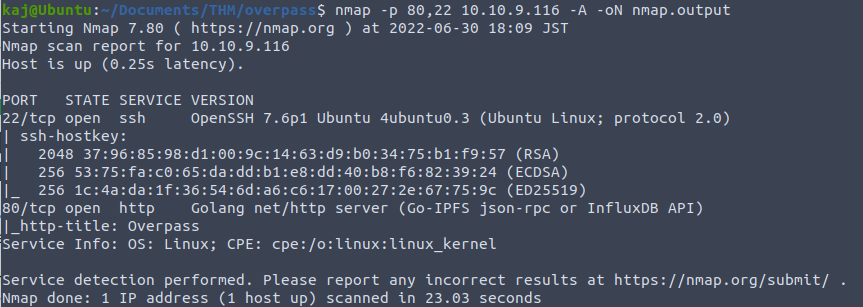 Next I will generally run an NMAP scan against the ports discovered, gathering more information. I also tend to save the output to a file. Saving it to a file will allow for us to refer to it later. For this particular room it is not essential considering only two ports and fairly straight forward but good practice.
