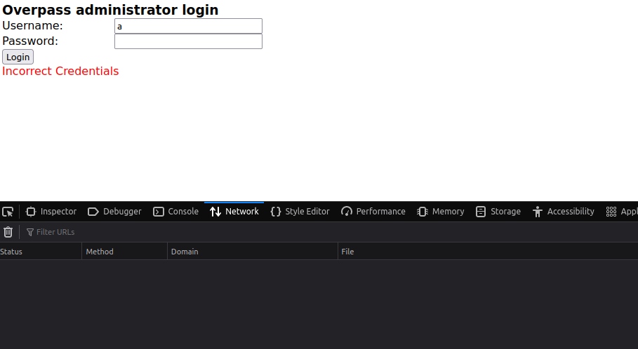 Great! The /admin page offers a way of authenticating. Generally I will run the request in burp to see what is being posted and what is being returned. Instead of burp we can also take a look at the inspector tool in Google Chrome or Firefox using F12. Lets head over to the network tab and see what takes place.