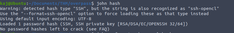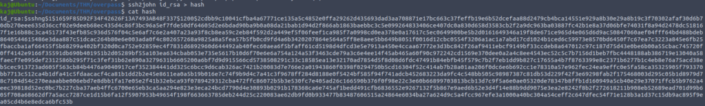 After trying some common passwords, it is time we try using some tools. First is ssh2john. ssh2john will take the private key and output a hash which can be used by john to bruteforce.
