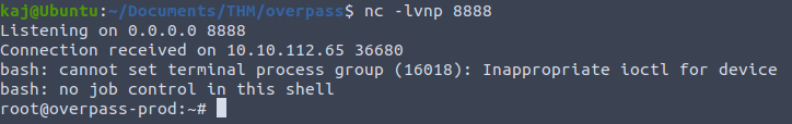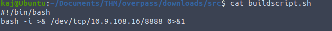 You will notice the very last job runs every minute. The root user will curl (download) a file from overpass.thm/downloads/src/buildscript.sh and then pipe that into bash (execute). If we take a look at the /etc/hosts file we will also notice we can write to it. Lets point overpass.thm to our tunnel address. From there we can then create a bash script to give us a reverse shell using netcat (nc).
