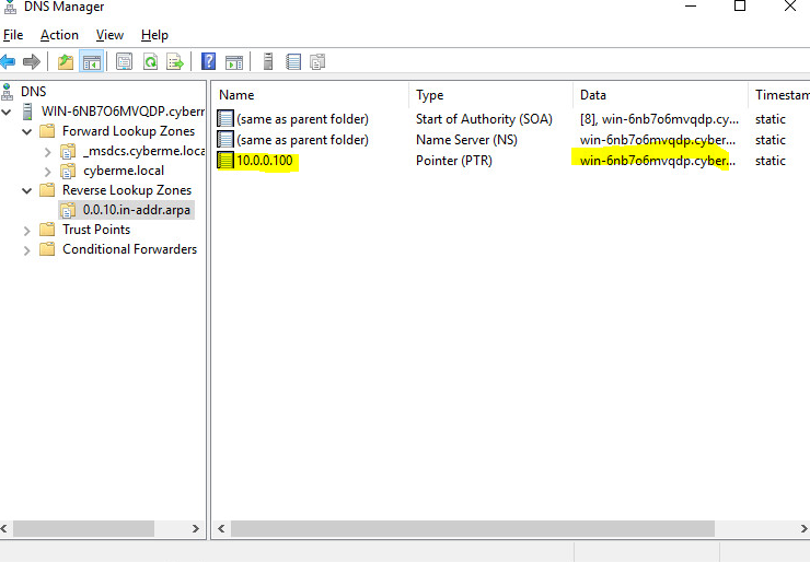Once that is complete you will then see a new PTR record under the Reverse Lookup Zone. To verify this worked we will use a tool called nslookup. This can be done in CMD or you can just right click the PC in the DNS manager at the very top and click “Launch nslookup”.