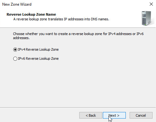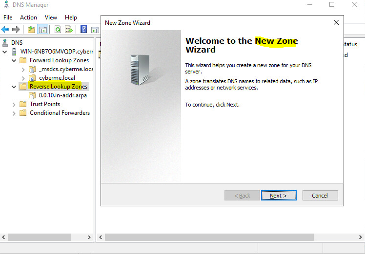 After verifying the Forward Lookup Zone is setup correctly we then want to create a Reverse Lookup Zone. Instead of an IP translating to the FQDN we will translate FQDN to an IP. Right click Reverse Lookup Zone and click “New Zone”.